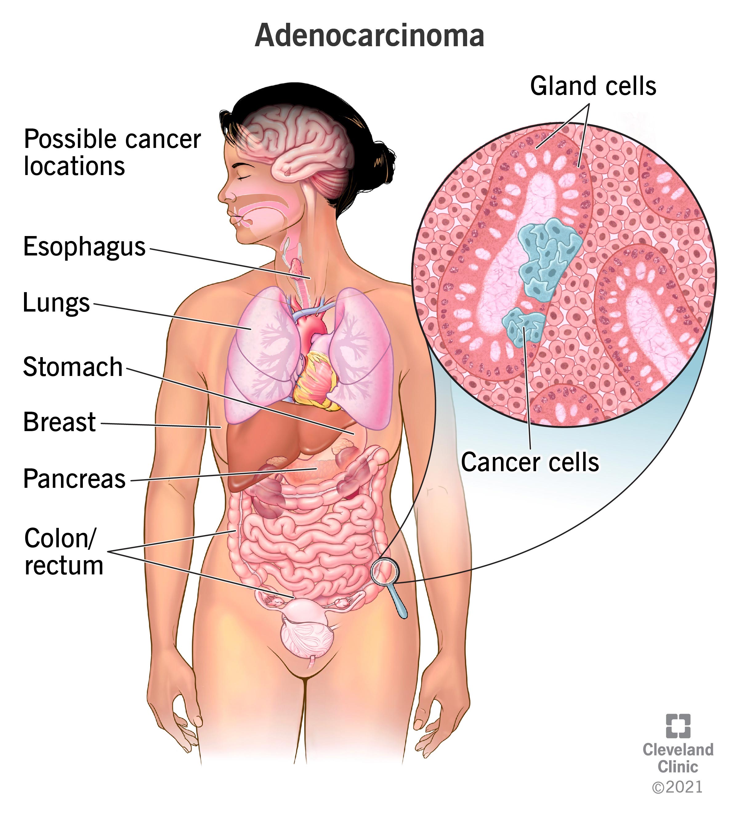 This type of cancer begins in epithelial tissues which include the skin, the lining of the internal organs, and those that line the body cavities including the chest and abdominal cavity. As carcinoma cells grow and multiply, they form solid masses called tumors. Cancer cells can break away from tumors and spread to other parts of your body (metastasize). Some of the most common Carcinoma types are Adenocarcinoma, which starts in the glands that line your organs, Basal cell carcinoma, which starts in the basal layer of your epidermis and is the most common form of skin cancer, and Squamous cell carcinoma, which starts in the top layer of the epidermis where there is the most sun exposure.